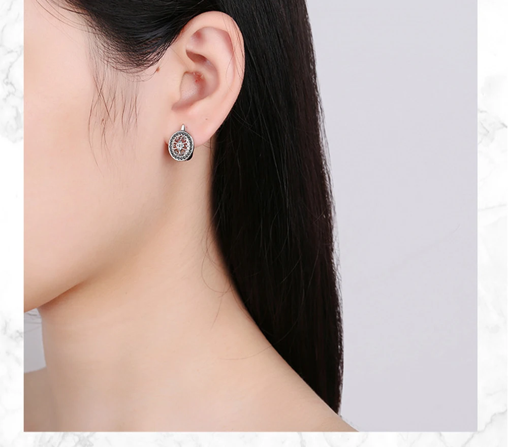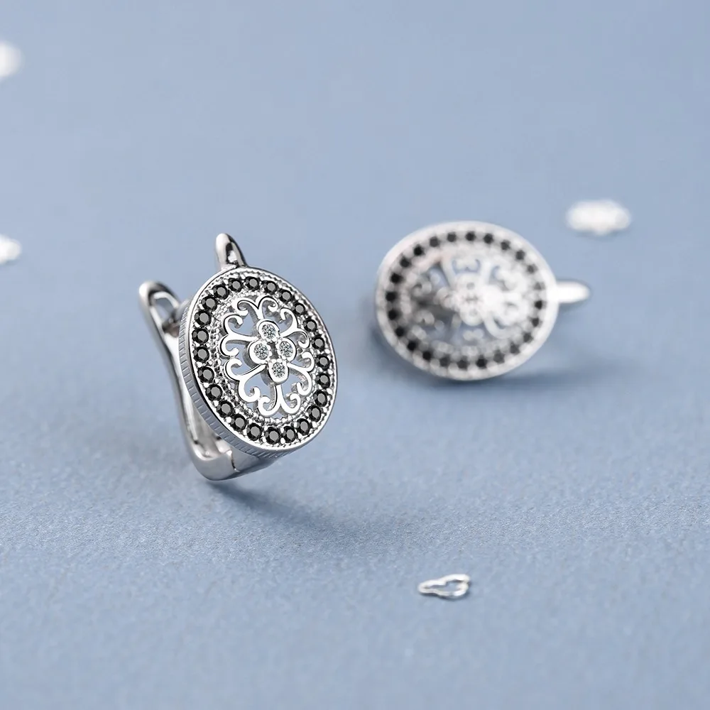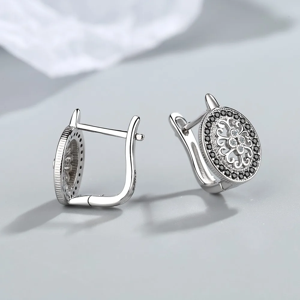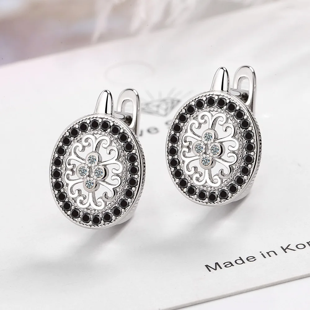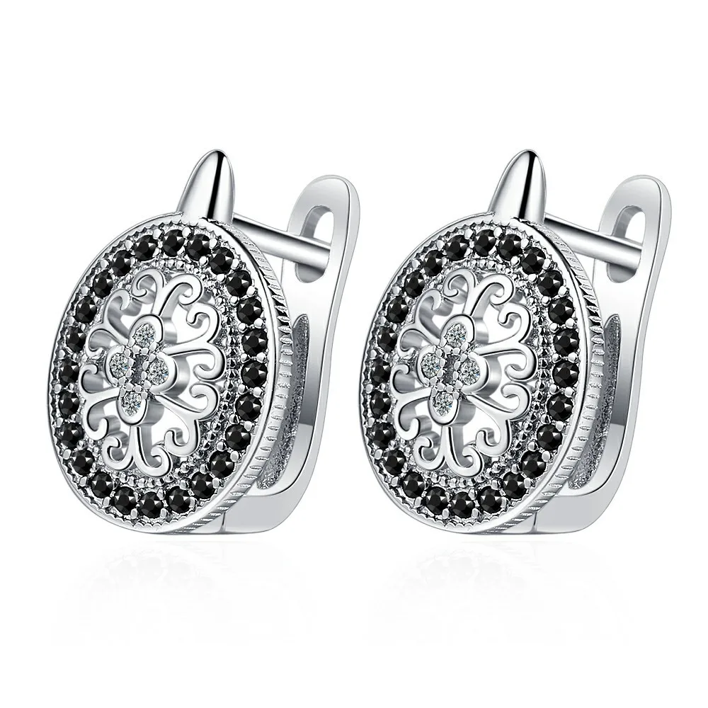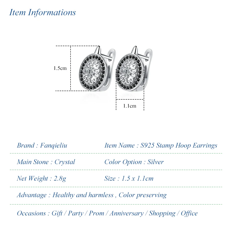 Fashion Jewelry New Solid 925 Sterling Silver Hollow Out Black Crystal Flower Hoop Earrings For Women FQL21237